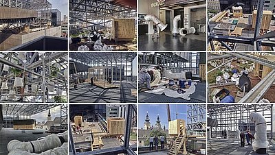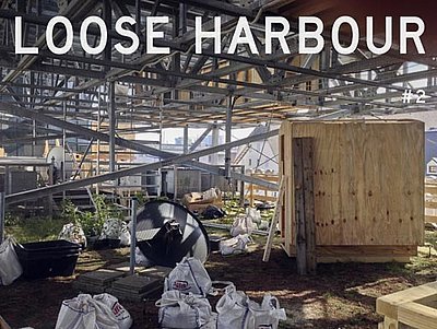 Unter dem Container, der die bisherige Geschichte von „Floating Village“ verdichtet mitführt, setzt sich die Raumkonstellation Loose Harbour fort. Die Nutzung der Zwischenräume des Stahlgerüstes verdeutlicht Aspekte von Einnisten und Einschleppen. Luken und „Seerohre“ erzeugen vertikale Durchlässigkeit und verbinden außerdem das „Schiff“ und die darunterliegende Dachfläche: Leo Schatzl und Studierende arbeiten hier als Gestrandete wie PionierInnen auf einer utopischen, weil nicht zuletzt unter einem Schiffsbauch liegenden Insel.