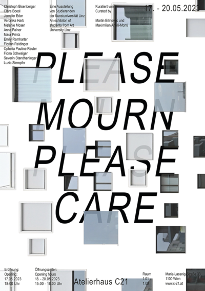 Das Ausstellungsprojekt » Please Mourn – Please Care« führt die beiden Lehrveranstaltungen »Einführung in die künstlerische fotografische Praxis« von Martin Bilinovac und »Labor Fotografie« von Maximilian Anelli-Monti am Institut für bildende Kunst und Kulturwissenschaften zusammen.