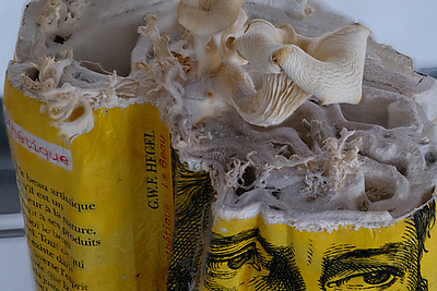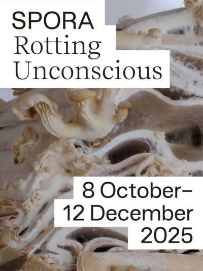 Das interdisziplinäre Kollektiv SPORA, mitbegründet von Charlotte Janis und Roberto Dell’Orco, fügt dieser Geschichte des Unbewussten eine weitere Wendung hinzu, indem sie den unterirdischen Ausstellungsraum des ifk in eine lebendige, verrottende Bibliothek verwandeln. Im Mittelpunkt des Projekts stehen Bücher, die sich mit dem Thema des Unbewussten befassen und buchstäblich von Pilzen, nämlich Pleurotus ostreatus, verdaut und transformiert werden. Im Laufe der Ausstellung werden sich Pilzhyphen durch die Seiten schlängeln und Zellulose, Tinte und Gedanken gleichermaßen neu ordnen – bis entlang der Buchrücken essbare Fruchtkörper sprießen.