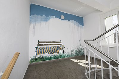 Die StudentInnen unterhielten sich mit den BewohnerInnen, hörten sich ihre Wünsche und Meinungen an, nahmen Stimmungen und Atmosphäre wahr und drückten dann das von ihnen Wahrgenommene künstlerisch aus. So entstand eine Beziehung zwischen BewohnerInnen und Raum. Die Wände erzählen von Obdachlosigkeit und vermitteln gleichzeitig ein Gefühl von Geborgenheit und Heimat.