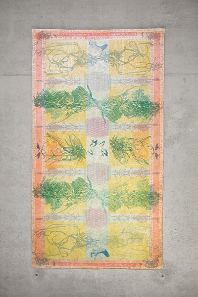 Monika Pichler, Lehrende der Malerei & Grafik zeigt ihre neue Arbeit „Algenteppich II“ Siebdruck auf Velours, 250 x 137 cm, 2024.