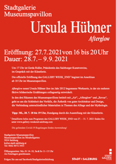 „Afterglow“ nennt Ursula Hübner ihre im Jahr 2012 begonnene Werkserie, in der sie mehrere fiktive bildnerische Erzählungen collageartig entwickelt. In den drei Räumen des Museumspavillons betitelt mit „Air“, „Afterglow“ und „Revue“, geht es um die Schönheit des Verfalls, die Ästhetik von guter Architektur und Design, die Verbindung unterschiedlicher Materialien in Themen des Alltags und der Mythologie.