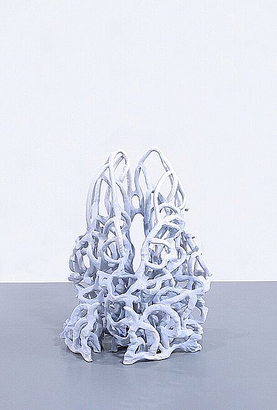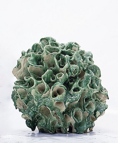 Ausgangspunkt für das künstlerische Schaffen von Helena Sekot sind Beobachtungen von Wachstumssystemen in der Natur. „Ich spüre Dualitäten und Polaritäten auf und versuche, deren Spannungen zu balancieren und in ihrer Gegensätzlichkeit zu vereinen“, sagt die Künstlerin. Die fragilen Keramikobjekte „Between Earth and Sky“ und „Elevate“ spiegeln diese Gegensätze von Wachstum und Vergänglichkeit eindrucksvoll wider, was an den faszinierenden Oberflächen liegt, die Helena Sekot aus dichroitischem Glas gestaltet: je nach Lichteinfall und Perspektive changieren die Werke in unterschiedlichen Farben. „Hier zeigt sich die vielschichtige Bedeutung des Ausstellungstitels ,Lichte Substanz`, der allumfassend auf das Licht, den Glanz, das Sphärische als auch auf die existentielle Tiefe, die Erdverbundenheit und die Materialisierung von inneren Welten verweist“, erklärt Sabine Isensee. Andere Skulpturen umspannen die Räumlichkeit und erinnern in ihrer Rhythmik aus vielzähligen Zwischenräumen an architektonische Gebilde, organische Netzstrukturen oder spröde Skelette.