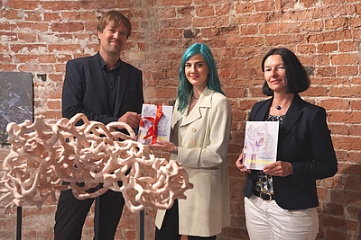 Katalogübergabe: v.l. Dr. Steffen Wiegmann, Leiter Stadtmuseum Oldenburg, Preisträgerin Helena Sekot und Dr. Sabine Isensee, Kuratorin und Leiterin Bildende Kunst