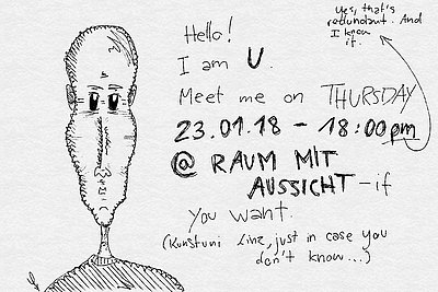 Elisabeth Hermi Prünster stellt in einer Performance den fiktiven Charakter U vor, der sie seit 10 Jahren begleitet. Bisher jat sich U meist auf Wänden, Papier oder in Büchern manifestiert.