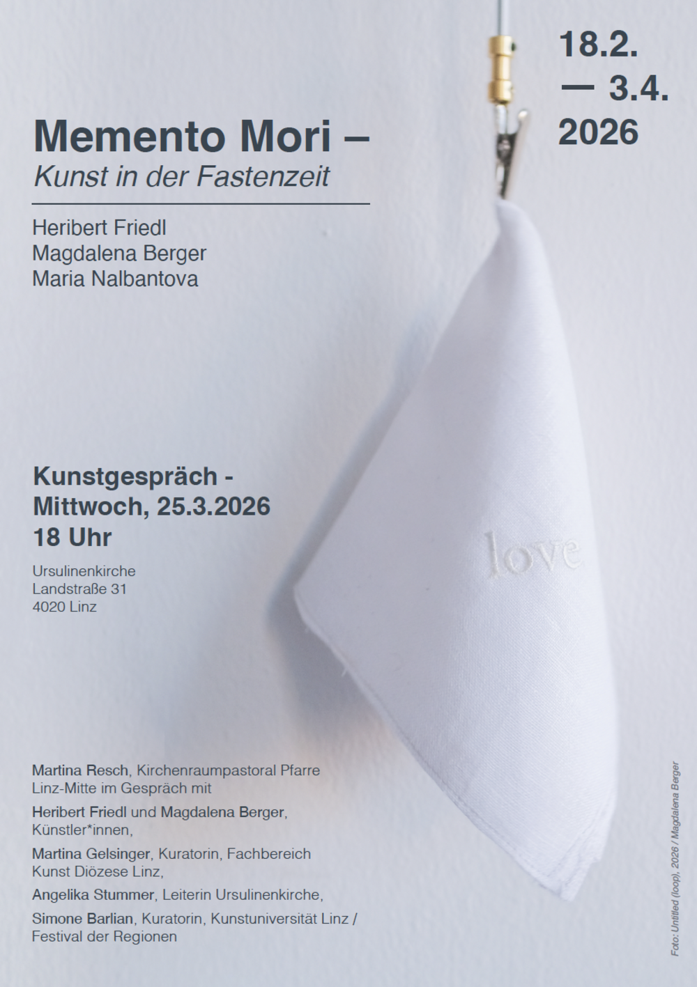 Die Künstler:innen, Heribert Friedl und Magdalena Berger, der Ausstellung von "Memento Mori - Kunst in der Fastenzeit" stehen für ein Kunstgespräch zur Verfügung und führen durch die Ausstellung die in Zusammenarbeit der Diözese Linz und der Abteilung Plastische Konzeptionen / Keramik entstanden ist.