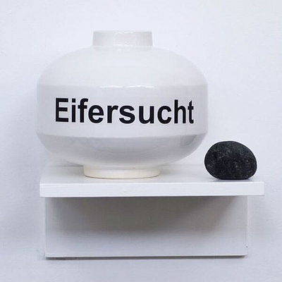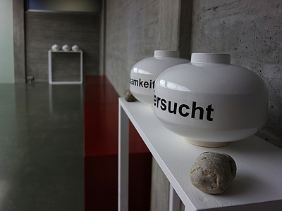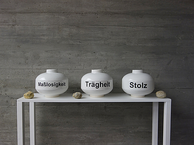 Die Gefäße von Frank Louis sind funktionale Objekte aus Steinzeugton mit glasierter, glatter weißer Oberfläche. Auf jedem der Gefäße steht in schwarzer Schrift ein Begriff, der eine Eigenschaft beschreibt: Maßlosigkeit, Trägheit, Stolz, Neid, Mitgefühl, Langsamkeit, Eifersucht.