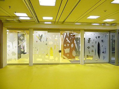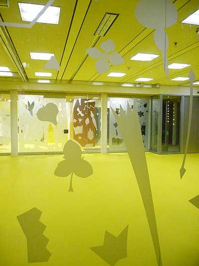 Klemens Figlhuber, Professor in der Abteilung Textil/Kunst&Design und freischaffender Künstler wurde mit der künstlerischen Ausgestaltung des Baukörpers beauftragt. Unter Berücksichtigung der vorhandenen Architektur hat er insgesamt 250 m² Glas mit tranluzenten Folien ausgestaltet. Sein Entwurf dafür wurde bereits am 23.09.2008 von der Immobiliengesellschaft der Stadt Linz im Rahmen der Initiative Kunst am Bau prämiert.