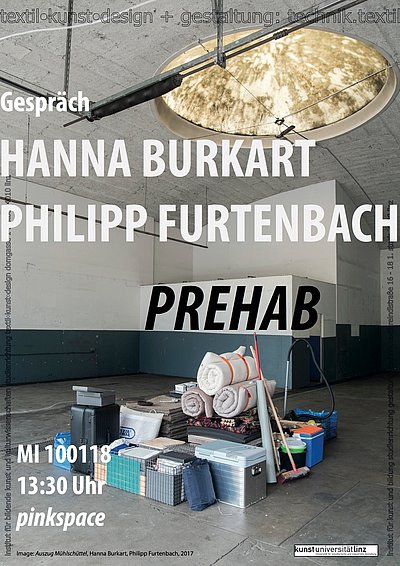 Hanna Burkart und Philipp Furtenbach leben seit mehr als eineinhalb Jahren ohne fixen Wohnort. In dieser Zeit haben sie zehn Orte bewohnt und auf ihren Reisen an mehr als 100 Plätzen übernachtet. Bei der Entwicklung und Erprobung neuer Lebensformen übersiedeln sie ihr Hab und Gut alle zwei Monate, um an Orten zu wohnen, die in ihrer Form dafür nicht gedacht oder geeignet sind. In ständiger Anpassung und Selbstbeobachtung erproben die Künstler neue Verhaltensformen. Als Vergegenständlichung dieser Entwicklung entsteht eine Reihe an Objekten. Prehab ist eine substanzielle Auseinandersetzung mit räumlichen Bedingungen, menschlichen Grundbedürfnissen, und den Kulturtechniken des Wohnens.