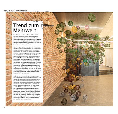 So auch in der Barichgasse 38. In der Fabricatur, einer modern revitalisierten Büroanlage der Amisola Immobilien AG, erwarten den Besucher im Eingangsbereich bunte, ungewöhnlich anmutende Kugeln. Geflochten aus Kabelbinder und baumelnd an fast unsichtbaren Fäden bilden diese Bälle eine wolkige Gemeinschaft, wenn auch etwas formlos. „Mit der Installation wollte ich die Vielfalt der Menschen in diesem Gebäude, deren unterschiedliche Herkunft und Tätigkeit zu einer losen Einheit zusammenfassen“, erklärt Künstlerin Astrid Young. Doch sieht man genauer hin, wird man bemerken, dass die Kugeln im unteren Bereich in Brauntönen