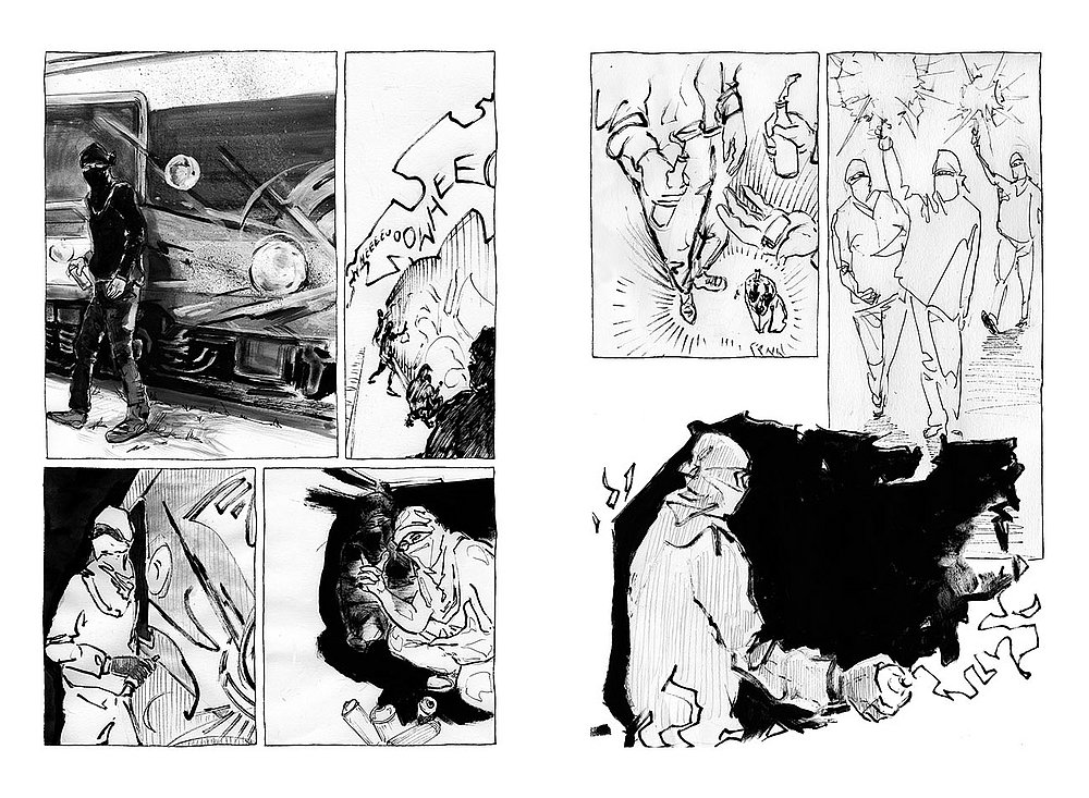 In hartem, virtuosen Schwarz-Weiß zeichnet Rubens Bugatti eine Geschichte von nächtlichen Streifzügen. Es geht um das Getrieben-Sein zur Aneignung urbaner Nicht-Orte und die Auseinander-setzung mit den langen Armen des Gesetzes, subsumiert in verschiedenen Episoden dieser Graphic Novel.