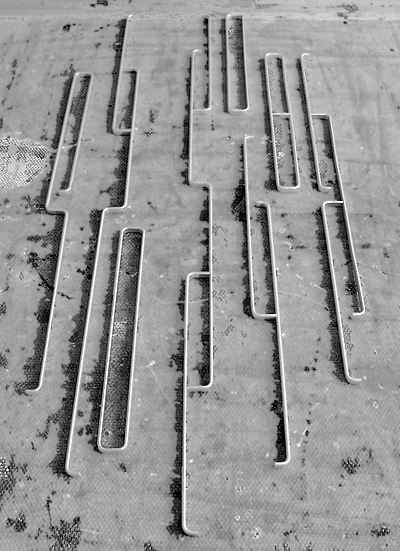 Die Aluminium-Teile liegen leicht erhaben auf einer Estrich-Armierung und werden dann oberflächenbündig mit geeignetem Beton ausgegossen. Die Bodenplastik ist begehbar und witterungsbeständig, sowie wartungsfreundlich.