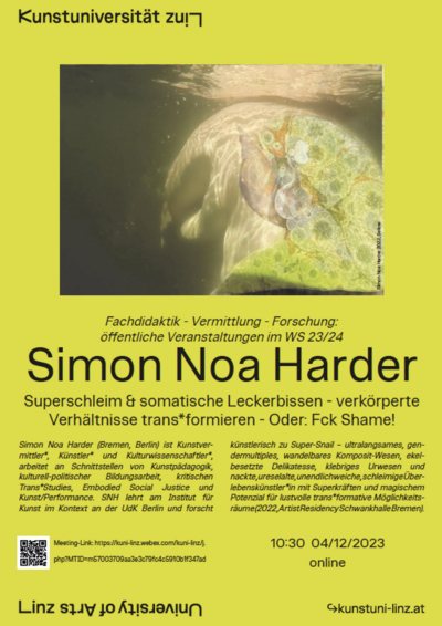 Simon Noa Harder (Bremen, Berlin) ist Kunstvermittler*, Künstler* und Kulturwissenschaftler*, arbeitet an Schnittstellen von Kunstpädagogik, kulturell-politischer Bildungsarbeit, kritischenTrans*Studies, Embodied Social Justice und Kunst/Performance. SNH lehrt am Institut für Kunst im Kontext an der UdK Berlin und forscht künstlerisch zu Super-Snail – ultralangsames, gendermultiples, wandelbares Komposit-Wesen, ekelbesetzte Delikatesse, klebriges Urwesen und nackte, ureselalte, unendlich weiche, schleimige Überlebenskünstler*in mit Superkräften und magischem Potenzial für lustvolle trans*formative Möglichkeitsräume (2022, Artist Residency Schwankhalle Bremen).