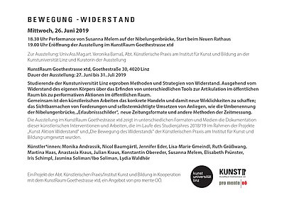 Die Ausstellung im KunstRaum Goethestrasse xtd zeigt in unterschiedlichen Formaten und Medien die Dokumentationdieser künstlerischen Interventionen und Arbeiten, die im Laufe des Studienjahres 2018/19 im Rahmen der Projekte„Kunst Aktion Widerstand“ und „Die Bewegung des Widerstands“ der Künstlerischen Praxis am Institut für Kunst undBildung umgesetzt wurden.