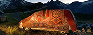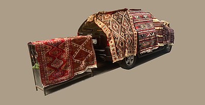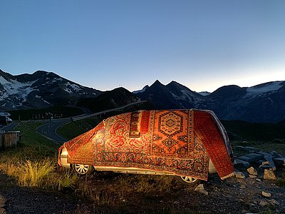 NOMAD: Über und über mit Knüpf- und Webteppichen behängt verweist NOMAD auf die mühsamen Alpenüberquerungen entlang historischer Güterwege, auf den Transport von Kulturgütern, ebenso aber auch auf liebevoll beladene Familienautos, die das Hab und Gut aus Ländern des globalen Südens nach Norden tragen.