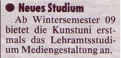 Bericht in der Kronen Zeitung vom 20. Mai 2009, S.27Ab Wintersemester 09 bietet die Kunstuni erstmals das Lehramtsstudium Mediengestaltung an.