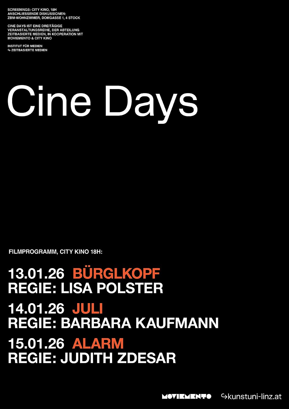 Die Abteilung Zeitbasierte Medien lädt in Kooperation mit moviemento und City-Kino zu den Cine Days #16. Am 13., 14. und 15. Jänner jeweils um 18.00 Uhr im City-Kino werden die Filme gezeigt. Die Diskussionen dazu folgen im ZBM-Wohnzimmer (Domgasse 1, 4020 Linz, 4. Stock).