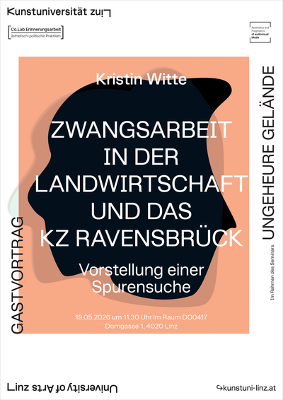 Das Co.Lab Erinnerungsarbeit · ästhetisch-politische Strategien und die Abteilung für Ästhetik und Pragmatik audiovisueller Medien laden zum Gastvortrag Zwangsarbeit in der Landwirtschaft und das KZ Ravensbrück. Vorstellung einer Spurensuche von Kristin Witte ein. Der Vortrag findet im Rahmen des Seminars Ungeheure Gelände – NS-Zwangsarbeit in Linz und Umgebung statt.
