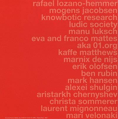 Christa Sommerer & Laurent Mignonneau, Rafael Lozano-Hemmer, Ben Rubin & Mark Hansen, aka 0100101110101101.org, Knowbotic Research, Erik Olofsen, Alexei Shulgin, Aristarkh Chernyshev, Manu Luksch, Mari Velonaki, Mogens Jacobsen, Marnix de Nijs, Kaffe Matthews, Ludic Society