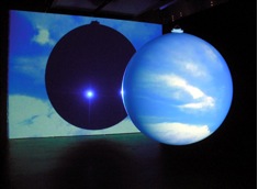 In 12 time zones around the earth videocameras are directed towards the sky and connected online to the InterNet. 12 videocameras – time-eyes – around the earth watch the sky  – INPLUSION. At a certain place on earth 12 screens are setup in a circle within a pavilion. Those screens are connected online via the Internet with the 12 time-eyes and transmit the sunlight from the 12 time zones – EXPLOSION. A sunclock is being created. With the rotation of earth, that means over time, the sunlight is moving within the circle of the screens. In the inner circle day and night can be experienced in parallels at the same time.