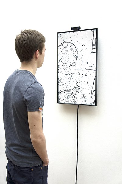 Portrait on the Fly (Interactive Version) is composed of a monitor that shows a swarm of ten thousand flies. When a person positions himself in front of it, the insects try to detect his facial features. They then begin to arrange themselves so as to reproduce them, thereby creating a recognizable likeness of the individual.. Posing in front of the monitor attracts the flies. Within seconds they invade the face, but even the slightest movement of the head or of parts of the face drives them off. The portraits are thus in constant flux, they construct and deconstruct. Portrait on the Fly is a commentary on our love for making pictures of ourselves (Selfie-Culture), it has to do with change, transience and impermanence.
