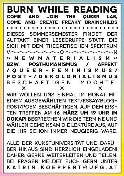 Wir wollen diverse Texte und Textsorten entdecken, lesen und gemeinsam abseits von Seminardynamiken diskutieren. Alle der Kunstuniversität und darüber hinaus sind herzlich eingeladen, mit Textvorschlägen vorbeizuschauen oder sich zur Lektüre neuer und unentdeckter Texte, Essays, Blog-Posts, Poems, Comics anstiften zu lassen.