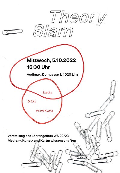 Die einzelnen Theorie-Lehrveranstaltungen des kommenden Wintersemesters werden zu Semesterbeginn beim Theory Slam im Pecha Kucha-Format vorgestellt. Stattfinden wird der Theory Slam diesmal im Audimax, anschließend gibt es ein Get-Together mit Snacks und Drinks. Die Veranstaltung ist für alle Studienrichtungen offen.