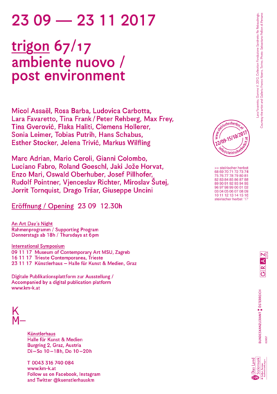 Micol Assaël, Rosa Barba, Ludovica Carbotta, Lara Favaretto, Tina Frank / Peter Rehberg, Max Frey, Tina Gverović, Flaka Haliti, Clemens Hollerer, Sonia Leimer, Tobias Putrih, Hans Schabus, Esther Stocker, Jelena Trivić, Markus Wilfling
