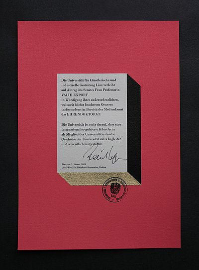Das unkonventionelle Design der Urkunde kohäriert mit dem Schaffen von VALIE EXPORT.