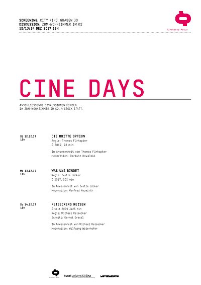 Cine Days ist eine dreitägige Veranstaltungs,-und Diskussionsreihe, der Abteilung Zeitbasierte Medien im Linzer Moviemento Kino, in der aktuelle Filme gesehen und zusammen mit den Filmemacherinnen und Filmemachern diskutiert werden. Die Veranstaltung steht thematisch im Kontext des jeweiligen Jahresthemas der Zeitbasierten Medien wie z.B. “Home Stories”, “Working Conditions” oder “Aneignung” und legt den Schwerpunkt auf experimentellere Positionen im zeitgenössischen Kino. Im Fokus stehen filmische Arbeiten mit dokumentarischem Ansatz, sowie politischem und sozialem Anspruch. Der Werkstattcharakter der Veranstaltung bietet den Studierenden eine Möglichkeit mit den eingeladenen Regisseurinnen und Regisseuren die Machart, aber auch die behandelten Themen des jeweiligen Films ausführlich zu diskutieren.