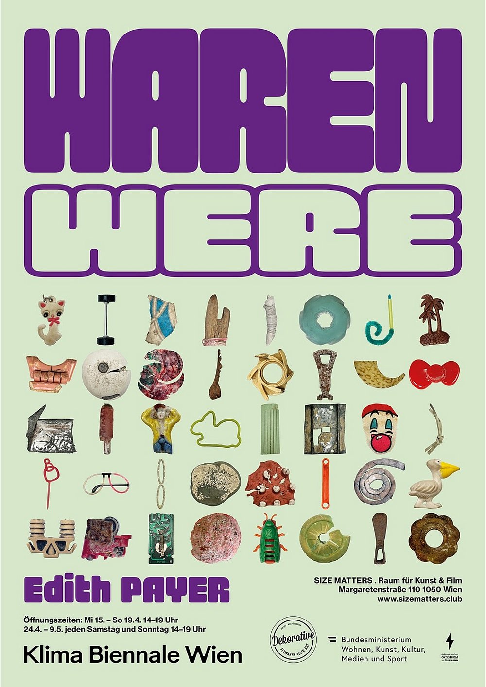 Edith Payer betreibt eine Fundstücksammlung, die bis mittlerweile mehrere tausend Gegenstände umfasst. Vom Boden aufgelesene Dinge und Reststücke, die aufgrund ihrer äußeren Erscheinung, Materialität, Form oder ihres Verfallszustandes auffielen. Für die Ausstellung WAREN werden die Fundstücke in einem installativen Rahmen, der an die Geschäftsarchitektur der 50er Jahre erinnert eingesetzt und mit ihnen eine Reihe von Präsentationsmethoden durchgespielt, angelehnt an kommerzielle aber auch museale Zeigweisen.