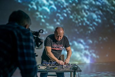 Mit "Node.Linz" liefert Fadi Dorninger bei Ars Electronica Home Delivery nicht nur aktuelle Stücke, sondern auch zeitlose Werke aus den späten 80igern und von 2001 ins Haus. Als weitere AkteurInnen sind Peter Androsch, Geza Eisserer, Nadja Schütz und Didi Bruckmayr zu sehen und zu hören.