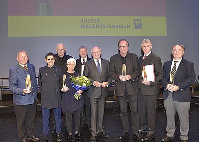 Gratulation an die Würdigungspreisträger durch Landeshauptmann Dr. Erwin Pröll (4.v.r.): Norbert Hauer (Volkskultur und Kulturinitiativen), Univ.Prof. Mag. Brigitte Kowanz (Bildende Kunst), Manfred Neuwirth (Kunstfilm), Mimi Wunderer-Gosch (Darstellende Kunst), Mag. Franz Thürauer (Musik), Dr. Robert Menasse (Literatur), Dipl.Päd. Ing. Hans Rupp (Erwachsenenbildung) und Erich Klein (Kultur- und Wissenschaftsjournalismus – Sonderpreis 2015). (v.l.n.r.) © NÖ Landespressedienst/Pfeiffer