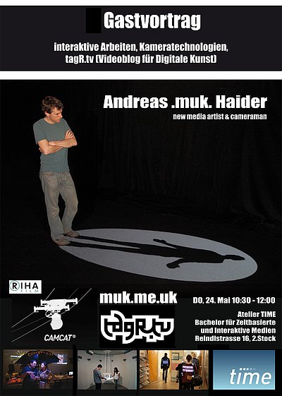 Der Medienkünstler, Kameramann und Co-founder des Videoblog TagR.tv Andreas.muk.Haider wird seine interaktiven Arbeiten vorstellen und über seine Arbeit als Kameramann sprechen.