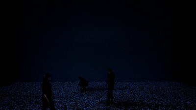 Am Boden sind tausende kleine Dreiecke zu sehen, die alle von links nach rechts fließen. Zusätzlich hört man Rauschen, das dem Rauschen eines Flusses ähnelt. Wenn Personen den Raum betreten, ändert sich der Fluss der Partikel. Sie fließen um jedes Hindernis herum oder stauen sich auf, wenn das Hindernis zu breit ist. Man kann perfekt in diese Illusion eines Teilchenstroms eintauchen.