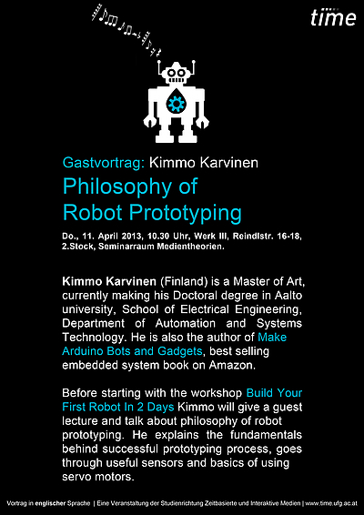 Before starting with the workshop, Kimmo will give a guest lecture and talk about philosophy of robot prototyping. He explains the fundamentals behind successful prototyping process, goes through useful sensors and basics of using servo motors.