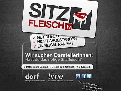 Sitzfleisch.TV, das neue Sendeformat auf "dorf tv", sucht DarstellerInnen. Alle Interessierten können sich bis Ende Oktober unter office@sitzfleisch.tv anmelden. Weitere Informationen zum Casting, zu den Anforderungen sowie zum Projekt selbst gibt's unter