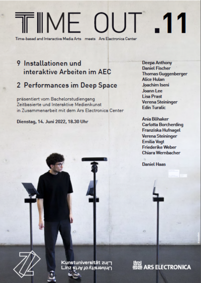 Die Studienrichtung „Zeitbasierte und Interaktive Medienkunst“ an der Kunstuniversität Linz und Ars Electronica stehen seit vielen Jahren in enger Verbindung. Im Rahmen der Ausstellungsreihe „TIME OUT“ stellt das Ars Electronica Center den jungen Medienkünstler*innen Ausstellungsraum für ihre Arbeiten zur Verfügung.
