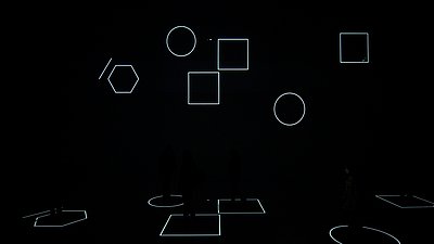 In the work „Sound Mapping“ by Clemens Niel, connections between sound, visualization, movement and position in space will be tested through trial and error. Once you enter the projection, you´ll find a geometrical form under your feet. If you get too close to another person these forms overlap and create a humming sound. You can also change the given geometrical form by jumping into the air or generate more forms by using both feet and hands.