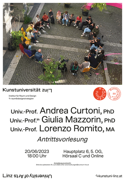 Antrittsvorlesung der Universitäts Professor*innen Giulia Mazzorin PhD, Lorenzo Romito MA und Andrea Curtoni PhD. Sie leiten zusammen mit Univ. Prof. Dr. DI Sabine Pollak die Abteilung raum&designstrategien.
