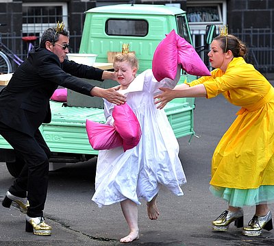 Ein kleines theatralisches Spektakel für Straßen und Plätze. Der mintfarbene Piaggio APE ist Transporter, Blickfang, Bühnenbild und mehr.