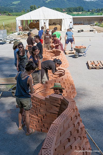 > Die Lehre – Sie vermittelt neben theoretischen Grundkenntnissen die elementaren Techniken des Lehm- und Bambusbaus in Form von drei- bis 14-tägigen Workshops mit bis zu 100 Beteiligten von allen Kontinenten. (40 Nationen waren bisher an BASE-Workshops beteiligt.)