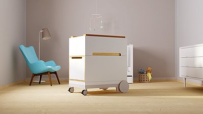 Corona-Babys wird’s freuen. Student Philip Mühlbacher hat einen Wickeltisch entworfen, der es buchstäblich in sich hat: Unter der Auflage zum Windelwechseln verbirgt sich platzsparend eine Badewanne, in die rollbare Kombination sind Heizung und Waage eingebaut. Lockdown-leidgeprüfte Eltern werden ein Feature besonders zu schätzen wissen: Die Kommode ist höhenverstellbar und damit rückenschonend.