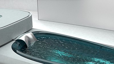 Eskapistisch hat Martin Schwab seine Wanne angelegt: Angelehnt an die Badekultur Japans gibt es zwei Bereiche, einen zur gründlichen Reinigung und einen zur anschließenden umfassenden Entspannung. Ein integrierter Bildschirm, der individuelle Wunschprogramme abspielt, unterstützt zusätzlich dabei, dem Lockdown temporär zu entfliehen.