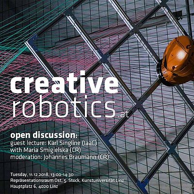 With Karl Singline and Maria Smigielska, Creative Robotics has invited two young and highly active researchers within that community. Karl’s lecture will focus on his experience and projects with robotic arms in Australia and most recently Barcelona. He will be joined by CR researcher Maria Smigielska who will give an insight into her current projects that happen between Linz, Switzerland, and Poland.