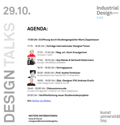 Während der Pause werden live spannende Projekte der Studierenden als virtuelle Ausstellung auf der Industrial Design Website vorgestellt.