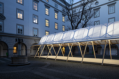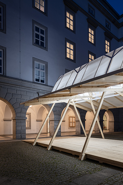 Die temporäre Pavillonarchitektur ist in einer einwöchigen Dachbauwerkstatt mit 15 Student*innen unter der Workshopleitung von Clemens Bauder (Univ.-Ass. die architektur) und Alexander Römer (Gastprof. raum&designstrategien) entstanden und stellt die Frage nach der Notwendigkeit von gedeckten Flächen in öffentlichen Räumen in der Form dieses Versuchsbaus im Maßstab 1:1.
