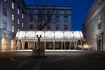 Die Form des "Kollektiven Dachs" basiert auf der Wiederverwendung von 2,4 x 2,4 m großen Dachelementen. Diese Dachflächen wurden erstmals im Rahmen des Supergau-Festivals 2021 für die temporäre Installation "SUPERORT" in Hof bei Salzburg verwendet. Die soziale Raumskulptur von Clemens Bauder und Constructlab erforschte das Potential öffentlicher Räume und Formen des Miteinanders im Rurbanen und schuf unterschiedliche Möglichkeiten für Interaktion, Diskussion und Intervention. Im September 2021 waren die Dachflächen Teil der Werkstätteninfrastruktur und Ausstellungsarchitektur des Spielorts "SUPERHOFEN" ebendort. Für den temporären Pavillon im Innenhof kommen 28 dieser Dachelemente zumindest bis Ende des Jahres nun zur finalen Anwendung. Als soziale Infrastruktur konzipiert, kann das "Kollektive Dach" – oder auch "Superdach" – von Studierenden, Universitätsangehörigen und der Stadtbevölkerung vielfältig als Freiluftwerkstatt, -galerie, -studio, -aufenthaltsraum genutzt werden.