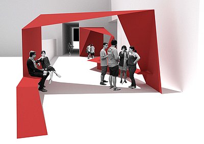 Das Siegerprojekt „Der rote Faden“ von Jamie Wagner (Studentin Architektur) überzeugt durch seine skulpturale Kraft und raumgreifende Dimension. Es ist ein Angebot an die Besucher*innen von Rohrbach-Berg auf ihr zu sitzen, zu liegen, zu stehen. Die Signalfarbe Rot strahlt über den Ort des Kunstwerkes hinaus und in die Stadt hinein, gibt Orientierung und führt zugleich auch in das Gebäude hinein.