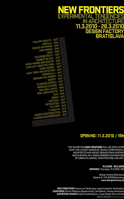 Die Ausstellung der ‚New Frontiers’ zeigt einen ersten Überblick über das vielfältige Schaffen slowakischer und österreichischer Architekten, Designer und Künstler der jüngeren Generation. Die Präsentation von realisierten Projekten steht dabei nicht im Vordergrund, jedoch der experimentelle Anspruch der individuellen Themenstellungen, Prozessen und entwicklungen. Zielsetzung ist,